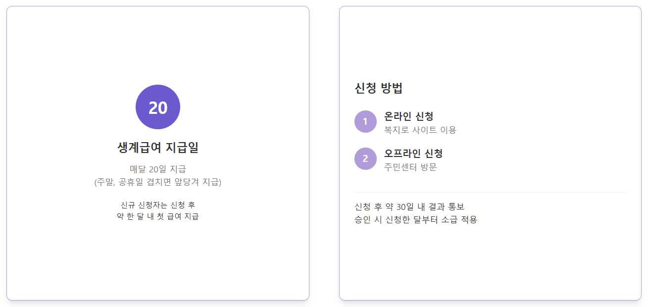 생계급여 지급일은 매달 20일입니다. 만약 지급일이 주말 또는 공휴일과 겹치면 앞당겨 지급되므로 매월 정확히 챙기는 것이 중요합니다. 신규 기초수급자라면 신청 후 약 한 달 내 첫 생계급여를 받을 수 있어요.