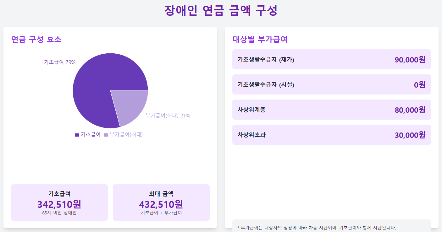 ※ 장애인 연금 금액은 개인의 소득, 재산, 연령, 가구 형태 등에 따라 달라질 수 있습니다.