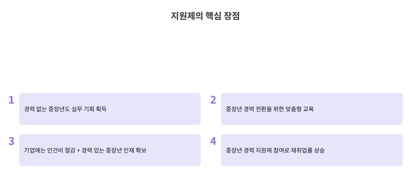 • 중장년 경력 지원제는 단순 교육이 아닌 실제 기업에서 실무를 경험할 수 있는 기회를 제공합니다.